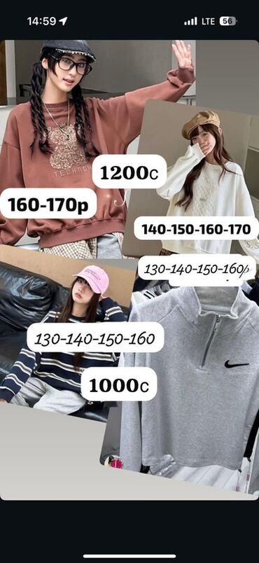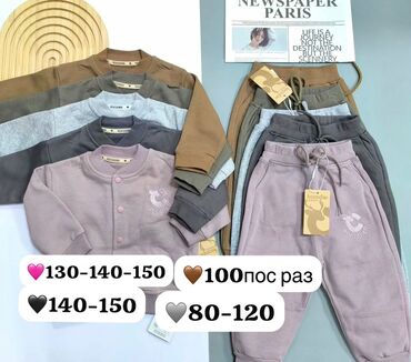 - Спортивные костюмы Kocodier: свитшоты/кофты на кнопках и брюки с поясом на шнурке, карманы, мягкий трикотаж. Базовые оттенки: пыльная роза, серый, графит, какао, хаки, светло‑серый. На кофтах и штанах — логотип утенка Kocodier. Указаны ростовки/замеры на фото: 130–150; 100 (пос. раз); 140–150; 80–120.