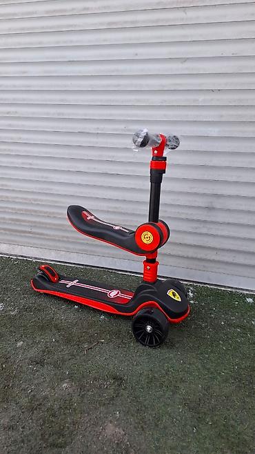 - Черно‑красный вариант со спортивным дизайном; оснащен дополнительным сиденьем/седлом, которое можно использовать как беговел‑сиденье на раннем этапе и убирать по мере роста ребенка.