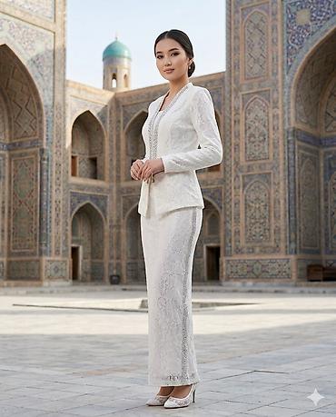 Женский нарядный костюм-двойка цвета айвори. Состав комплекта: - Юбка-карандаш на подкладке, длина миди. - Жакет с лацканами и декоративной застёжкой на 5 пуговиц; рукава 3/4 из ажурного сетчатого...