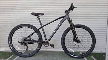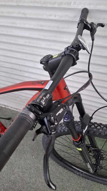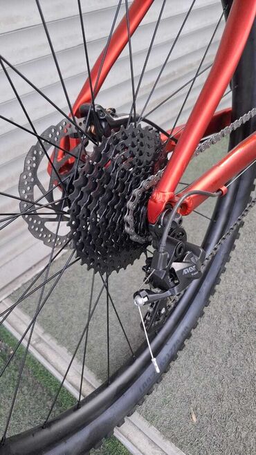 Горный велосипед в красно-черной раме. Оснащен амортизационной вилкой для комфортной езды по пересеченной местности. Имеет дисковые тормоза для надежного торможения в любых условиях. Переключатели скоростей обеспечивают плавное и точное переключение передач.