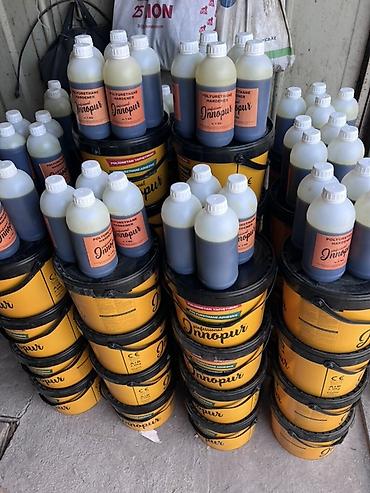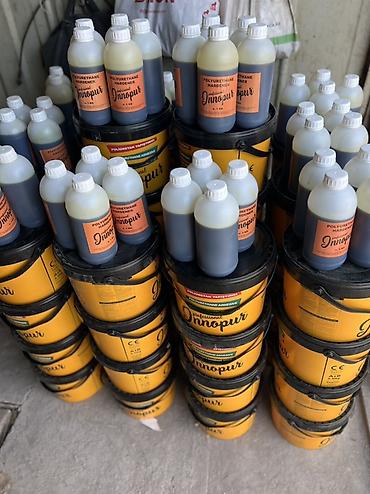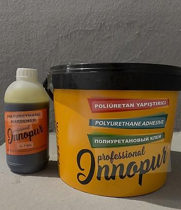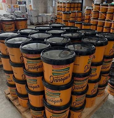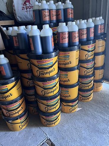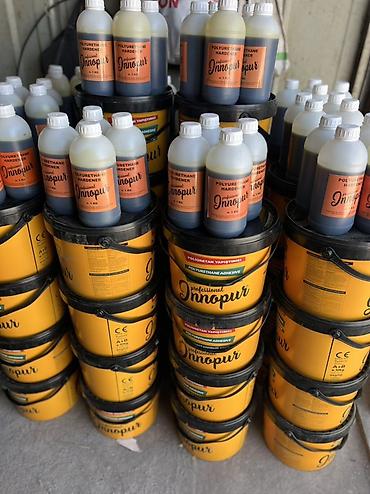 - Комплект: ведра с полиуретановым клеем Innopur (желтые ведра с крышкой) и жидкий отвердитель Innopur Polyurethane Hardener (бутылки 1 кг).
