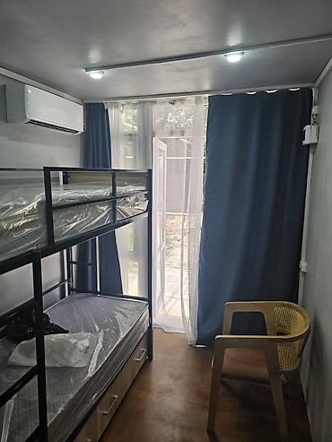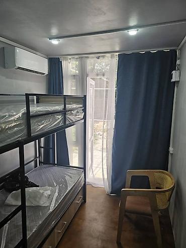- Планировка: комната с двухъярусной кроватью и выдвижными ящиками для хранения, выход на светлое окно/дверь с занавесками.