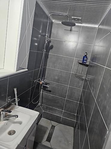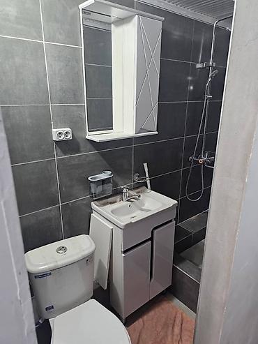 - Санузел: унитаз, тумба с умывальником и зеркальным шкафчиком, душевая зона с ступенью и душевой стойкой.