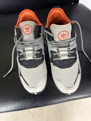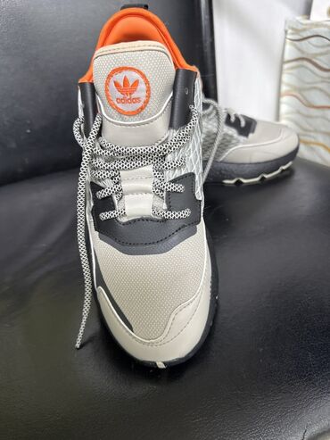 Кроссовки Adidas (логотип Trefoil). Современный мультиколор: светло‑серый/бежевый верх с черными накладками и ярко‑оранжевой внутренней отделкой; элементы зелёного и оранжевого на подошве.