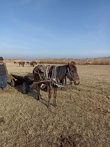 - Гужевой комплект: упряжь, хомут, оглобли, поводья, подпруги, удила; установлена рабочая телега на пневматических колёсах.