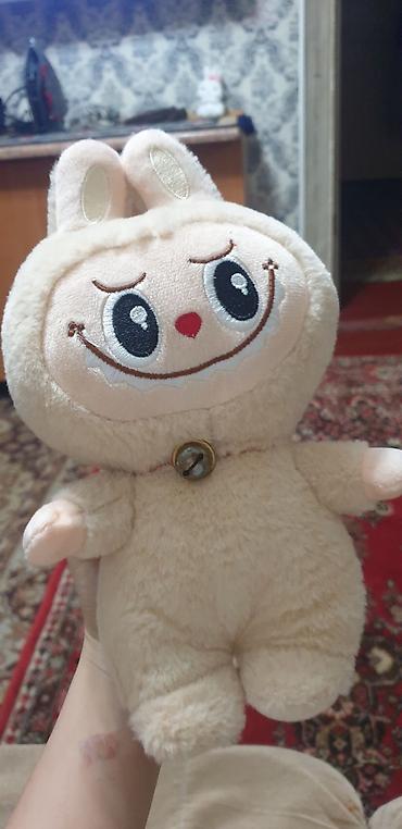 - Персонаж в голубом плюшевом комбинезоне с колпаком и пончиком на животике: пластиковая мордочка, мягкое тело и ушки.