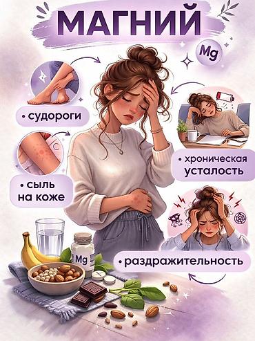Дополнительно: иллюстрация напоминает о возможных признаках нехватки магния (судороги, хроническая усталость, раздражительность, высыпания на коже) и источниках Mg в питании.