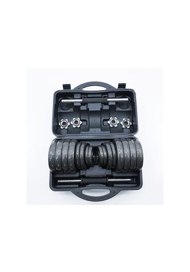 Набор гантелей 30 кг в пластиковом кейсе Элегантный и практичный набор для домашних и профессиональных тренировок. Все элементы удобно размещены в прочном кейсе с ручками. В комплекте: Общий вес: 30 кг 2 гантельных грифа с резьбовыми фиксаторами и антискользящими насечками. Блины разного веса — выглядят стильно, устойчивы к коррозии и легко чистятся.