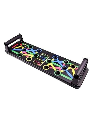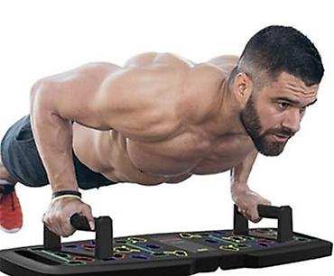 - Многофункциональная платформа для отжиманий с цветной схемой положений: грудь (red), трицепс (yellow), плечи (blue), спина (green). Каждому цвету соответствуют отверстия для установки рукояток под нужный угол и ширину хвата.