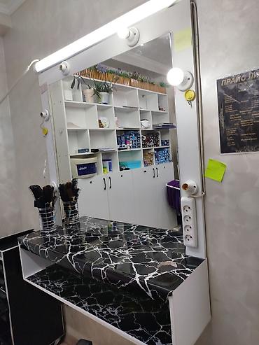 - Зеркальный пост визажиста/парикмахера: большое зеркало в раме с подсветкой по периметру, розеточный блок сбоку. Столешница под «черный мрамор» с защитным бортиком и нишей-полкой для инструментов, отверстия под фен/щетки.