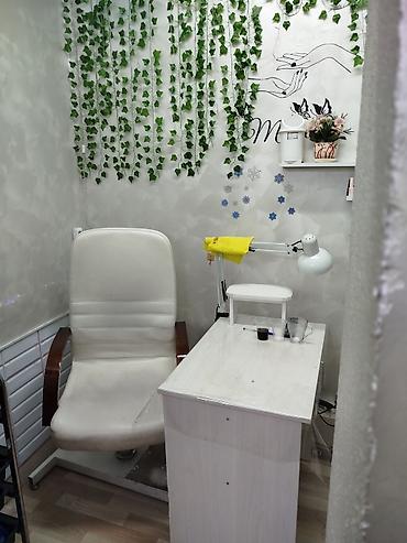 - Стол для мастера маникюра из светлого ЛДСП с ровной столешницей, выносной подставкой под руки клиента и настольной лампой на кронштейне. Под столом предусмотрено место для техники и проводов.