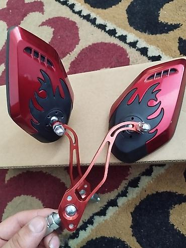 - Корпус зеркал: аэродинамический, красный металлик с чёрным декоративным рисунком «пламя».