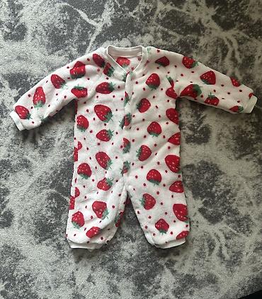 Флисовый слип с принтом в виде клубники, очень теплый, спереди кнопки по всей длине. Примерно до 3-4 месяцев, в зависимости от роста ребёнка.