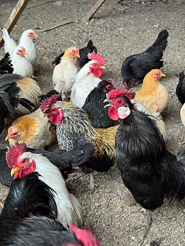 Петухи домашнего разведения - Породы/окрасы: светлые (белые, бело‑чёрные), кремовые и тёмные особи. - Выгульное содержание на участке, свободный выпас. - Крупные петухи с выраженным гребнем и опер...
