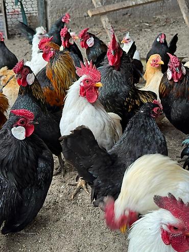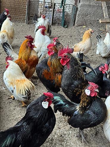 Петухи домашние, разноцветные (пёстрые и рыже‑чёрные окрасы). все три петухи по 1000 сом