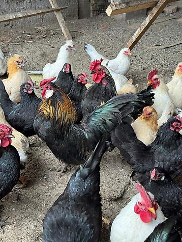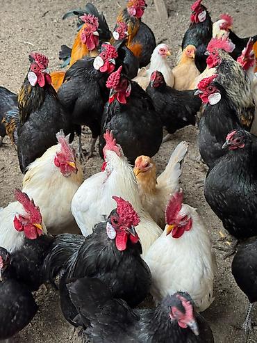 Петухи домашнего разведения - Породы/окрасы: светлые (белые, бело‑чёрные), кремовые и тёмные особи. - Выгульное содержание на участке, свободный выпас. - Крупные петухи с выраженным гребнем и опер...