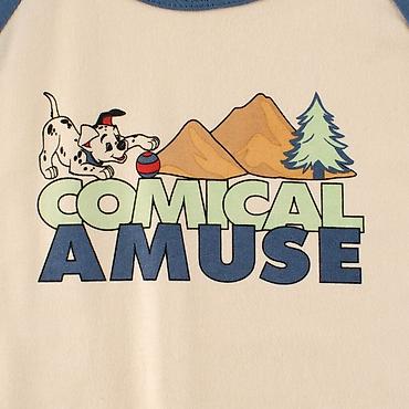 - Принт на груди: щенок с мячиком, горы и ёлка; надпись “COMICAL AMUSE”
