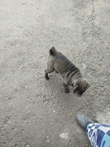 Щенок с короткой гладкой шерстью, окрас черный с белыми отметинами на груди и лапах. Компактное, крепкое телосложение, широкая мордочка с выраженными складками, короткие уши, толстый хвост. Лапы мо...