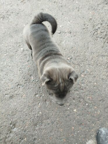 ШарпейЩенок породы шарпей, окраса «синий» (серо-стальной). Характерные породные признаки: складчатая кожа, широкая мордочка «гиппопотам», маленькие прижатые уши, плотный хвост, закрученный кольцом. Компактное, коренастое телосложение, густая короткая шерсть без подшерстка.