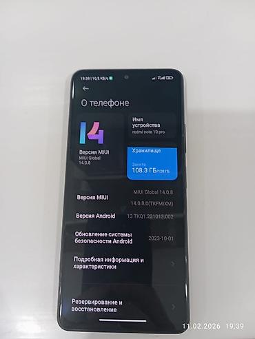 Смартфон Redmi Note 10 Pro - Экран: 6.67" AMOLED, тонкие рамки, фронтальная камера в отверстии по центру. - Память: на фото “О телефоне” видно 128 ГБ хранилища (свободно ~70 ГБ). - ПО: MIUI Global...
