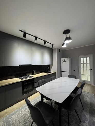 - Отдельная кухня-столовая: линейный гарнитур в матовом сером, фартук под каменную текстуру, столешница под дерево, встроенная газовая варочная панель, духовой шкаф, вытяжка, мойка с черной фурнитурой, высокий холодильник. Обеденная зона: прямоугольный стол под мрамор, 6 мягких стульев. Потолочное освещение: трековые светильники и подвесная люстра.