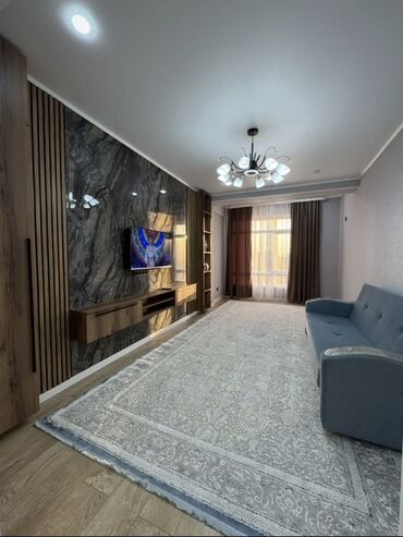 - Просторная гостиная с ТВ-зоной, декоративной панелью под камень и нишами для хранения, большое окно с плотными шторами.