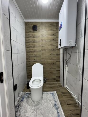 - Санузел с ванной: комбинированная отделка плиткой под дерево и камень, тумба с умывальником и круглым зеркалом с подсветкой, душевая стойка, шторка, стиральная машина.
