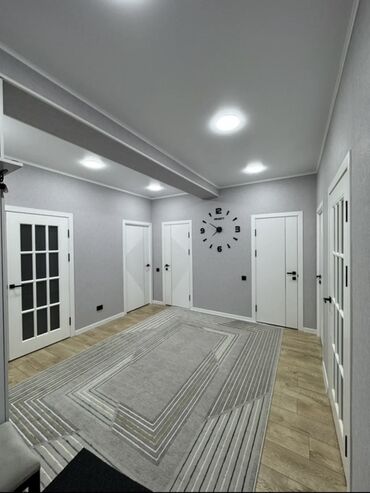 - Коридоры и комнаты с ровными светлыми стенами, натяжные потолки, единый напольный контур под дерево.