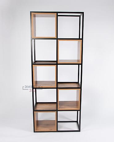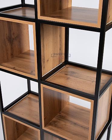 Эффектный и практичный стеллаж для дома, офиса или шоурума. Открытая конструкция с черным металлическим каркасом и нишами из ЛДСП цвета дуб Вотан. Каждая секция оформлена в виде куба — удобно для хранения, декора или книг.