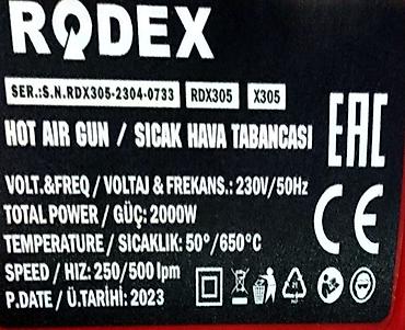Строительный фен Rodex с горячим воздухом, выполненный в красно-черном цвете. Инструмент оснащен мощным нагревательным элементом и позволяет регулировать температуру в диапазоне от 50°C до 650°C, а также скорость потока воздуха 250/500 л/мин. Подходит для различных задач, таких как удаление краски, пайка, сушка или формовка материалов. Компактный дизайн обеспечивает удобство в использовании и хранении.Напряжение: 230В/50ГцМощность: 2000 ВтТемпература: 50°C - 650°CСкорость потока воздуха: 250/500 л/минМодель: RDX305/X305Серийный номер: RDX305-3Год производства: 2023