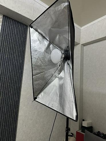- Осветительный комплект для фото и видео: софтбокс с отражающей серебристой внутренней поверхностью и ламповым цоколем E27 (лампа на фото установлена).