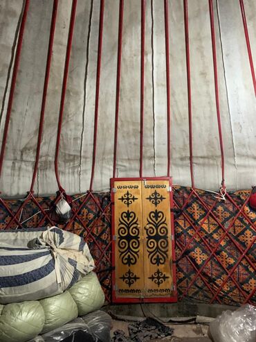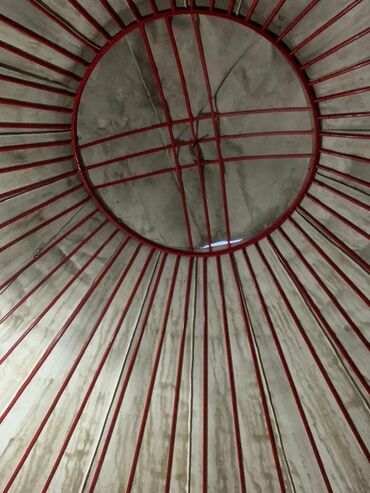 - Каркас из деревянных решёток (хана) с красной окраской; купольные стропила (уык) сходятся к круглому световому проёму (шанырак/тюндюк).