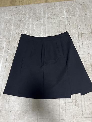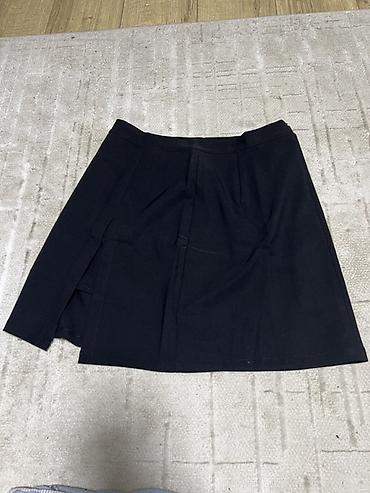 Юбка А‑силуэта, черная, с передней застежкой‑молнией по центру (носили 2-3 раза) - Два накладных кармана спереди. - Пояс со стойкой, фиксируется двумя металлическими кнопками сверху молнии. - Дли...