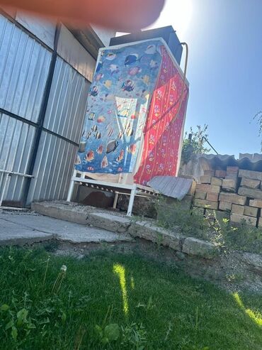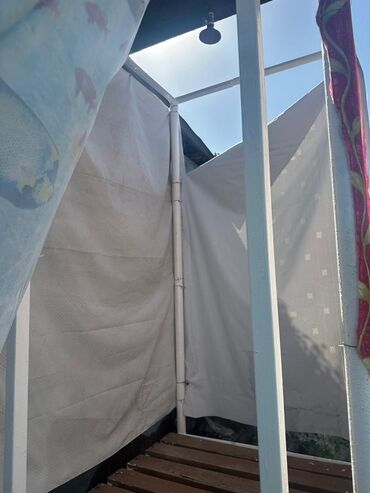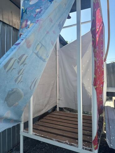Уличный душ с металлическим каркасом и баком для воды сверху, идеально подходит для дачи или загородного дома. Оснащен сливной решеткой из деревянных реек. Шторки с яркими принтами рыбок и цветочным орнаментом обеспечивают приватность. Конструкция предусматривает использование в теплое время года для комфортного принятия водных процедур на открытом воздухе.