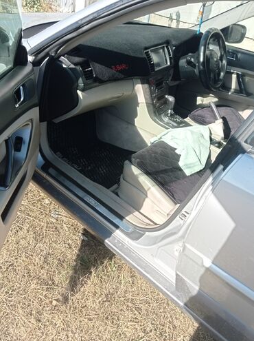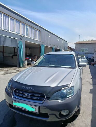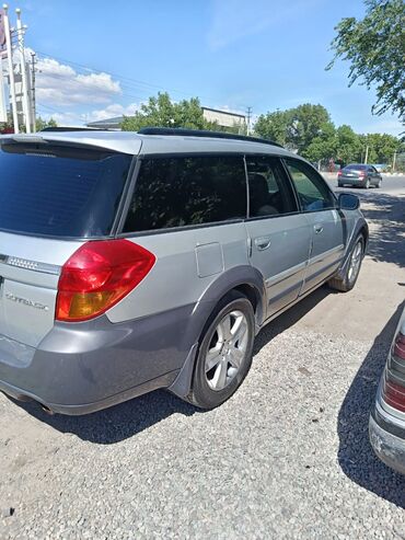Subaru Outback универсал (поколение BL/BP), правый руль. Серебристо‑серый двухцветный кузов, обвес с расширителями арок, рейлинги на крыше, спойлер двери багажника. Литые диски, дисковые тормоза по кругу, противотуманные фары, пластиковый дефлектор капота с надписью OUTBACK, тонированные стекла.