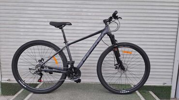 Велосипед с передней амортизационной вилкой, предназначенный для катания по пересеченной местности. Рама выполнена в темно-сером цвете. Оснащен дисковыми тормозами для эффективного торможения в различных условиях. Подходит для активного отдыха и поездок по бездорожью.