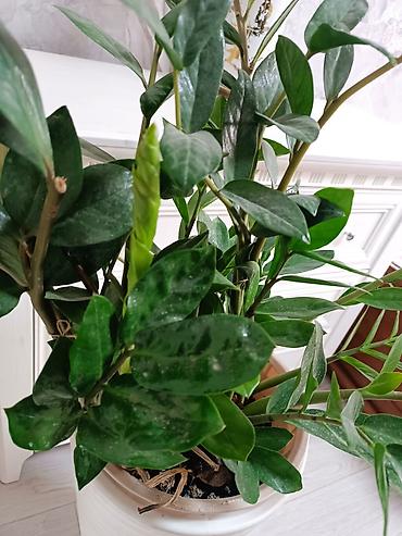 - Крупное комнатное растение с плотными глянцевыми листьями, несколько мощных побегов и молодые ростки.
