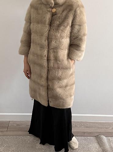 Шуба из норки, натуральный мех, цвет светлый беж/пудра. - Длина: миди (ниже колена). - Посадка: прямой свободный силуэт. - Рукав: 3/4 с объёмной манжетой. - Воротник: стойка. - Застёжка: ...