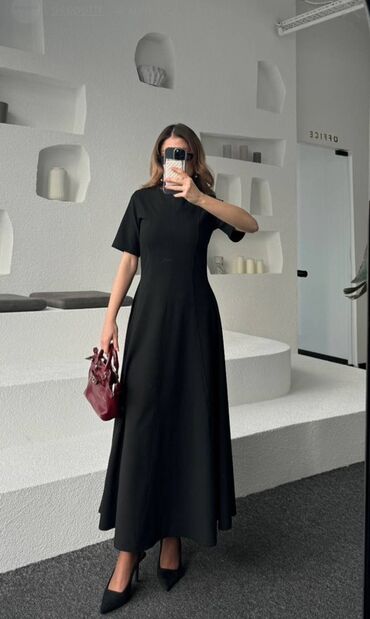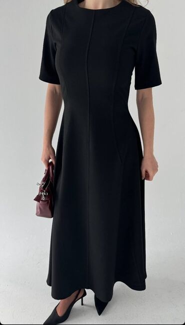 Элегантное черное платье-миди с короткими рукавами. Приталенный силуэт подчеркивает фигуру, а расклешенная юбка добавляет легкости. Идеально подходит для создания как повседневного, так и вечернего образа. Универсальный вариант для любого случая.