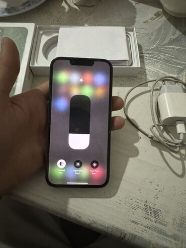 IPhone 13 зелёный цвет корпуса. Компактный смартфон с 5.4" OLED‑дисплеем Super Retina XDR, вырезом под фронтальную камеру и поддержкой True Tone и Night Shift (управление яркостью на скриншоте). Плоские алюминиевые грани, разъём Lightning, стереодинамики. Две основные камеры с ночным режимом, фронтальная камера с Face ID.