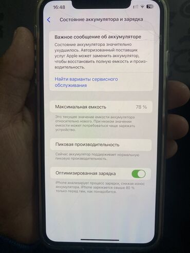 - Аккумулятор: максимальная ёмкость 78%, оптимизированная зарядка включена; в разделе состояния выводится сообщение о необходимости сервисной замены для восстановления полной ёмкости