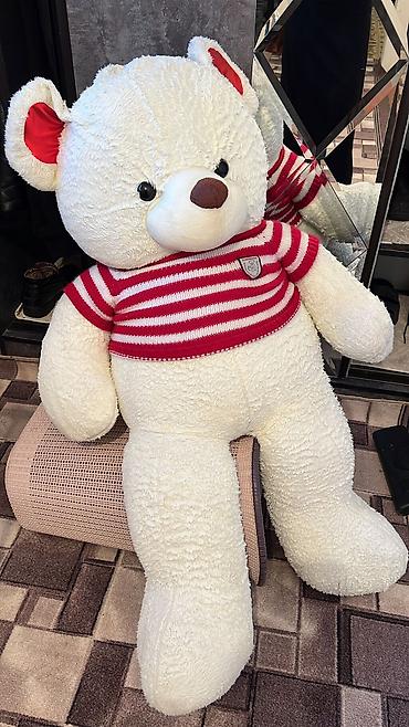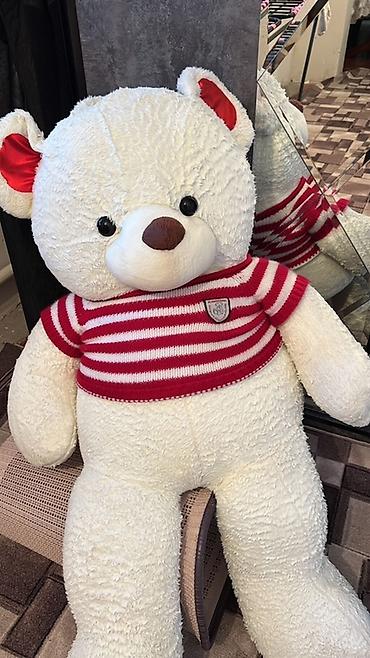 - Цвет: молочно‑белый мех, свитер в красно‑белую полоску с небольшим нашивным значком на груди; внутренняя часть ушек — красная атласная.
