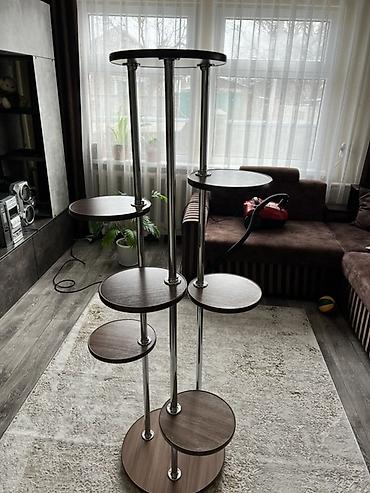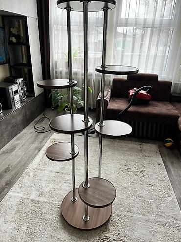 - Диаметр малых полок ориентировочно 20–25 см, средних — около 30 см, верхней — около 40 см. Высота стойки примерно 150–170 см.