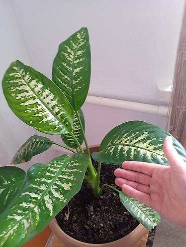 - Диффенбахия: куст с пёстрыми зелёно-кремовыми листьями овальной формы. Компактная розетка с мощными черешками. Предпочитает яркий рассеянный свет, теплое содержание и регулярный полив без застойной влаги. Хорошо реагирует на подкормки для декоративно-лиственных. Пересадка в питательный дренированный грунт раз в 1–2 года.