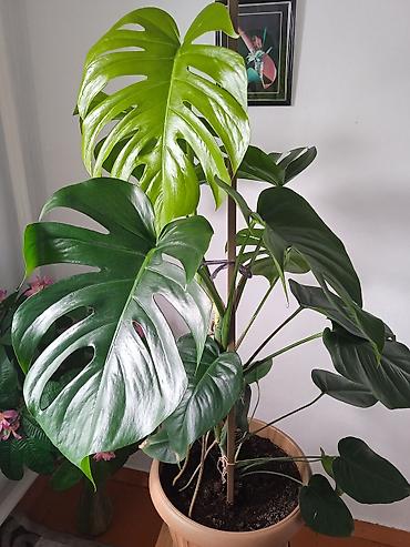 - Монстера делициоза (Monstera deliciosa): крупное лиановидное растение с рассечёнными и перфорированными листьями. Установлена опора для вертикального роста. Листовые пластины глянцевые, крупные, формируются новые рассечённые листья. Подходит для светлых комнат с рассеянным освещением. Любит умеренный полив, рыхлый субстрат, опрыскивания. Можно направлять по мху/опоре, легко черенкуется воздушными корнями.