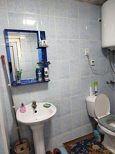 - Уютный санузел: кафельная облицовка, унитаз, раковина на пьедестале, зеркало с полочками, душевой уголок с шторкой, накопительный водонагреватель.