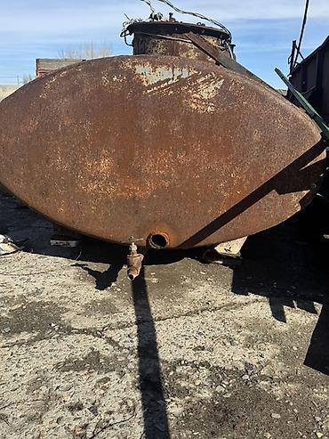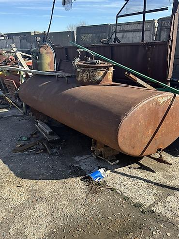 Металлическая цистерна горизонтального типа на раме. - Предположительный объем: ориентировочно 4–6 м³ (визуально — крупная, овальное сечение). - Материал: сталь, толщина стенки массивная. - Констр...