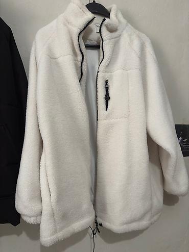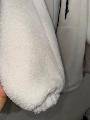 Теплая женская куртка-бомбер из мягкого «овчинного» флиса. - Бренд: fame (на ярлыке) - Размер: M–L (указан на бирке) - Цвет: молочный с ярко‑зелеными акцентами - Материал верха: пушистый шэрпа/фли...