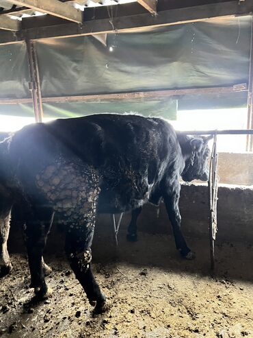 Уй сатылат 8 жарым ай бооз Коровa черной масти (рогатая), на привязи. Крепкая, широкотелая, с выраженным мясным телосложением: глубокая грудь, широкая спина, развитые окорока. Видно бирки в ушах. С...