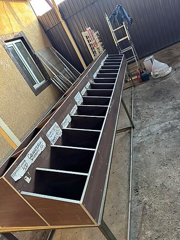 Универсальный стеллаж-витрина из дерева и металла. Конструкция состоит из длинного деревянного каркаса коричневого цвета с белой окантовкой, разделенного на множество секций для удобного размещения товаров. Каркас установлен на прочное металлическое основание светло-желтого оттенка. Этот стеллаж идеально подходит для использования в магазинах, на рынках или в выставочных залах для демонстрации различных товаров. Его лаконичный дизайн легко впишется в любой интерьер.